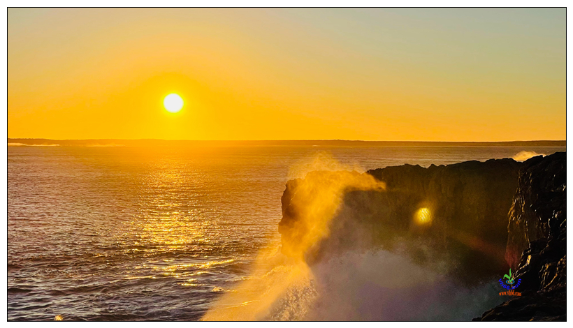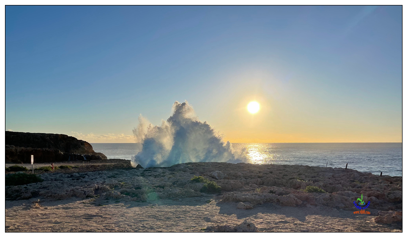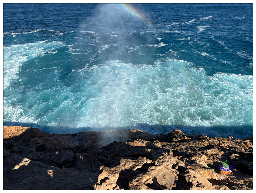 峭壁上有好多这种喷水洞,潮水一来,水雾直喷而起,形成彩虹。天然景色,就一个字, 美!