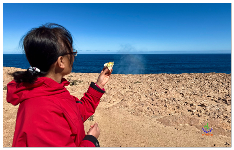 有了这些峭壁喷水洞,我们的早餐,连盐都省了。卷上鸡蛋牛油果,等海雾飘过来,吃上一口,天然盐巴,够味!