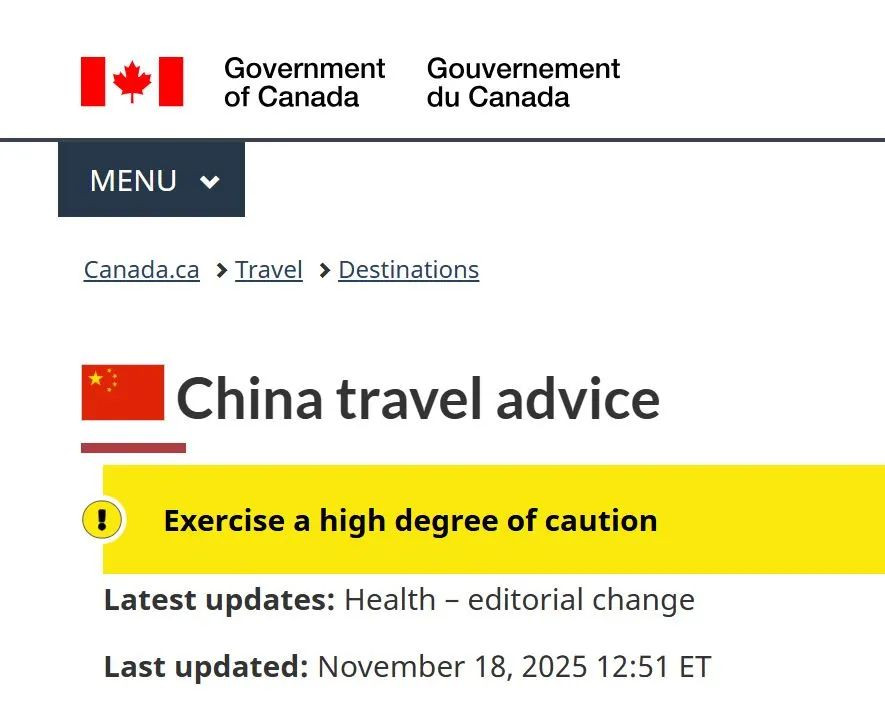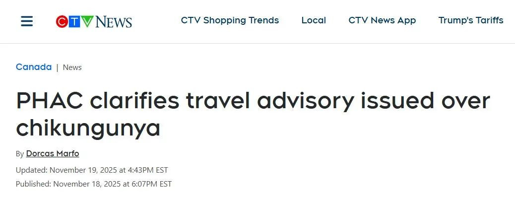 11月18日,据报道,加拿大紧急更新了前往中国的旅行建议,提醒前往中国的旅客注意基孔肯雅病(chikungunya)风险。