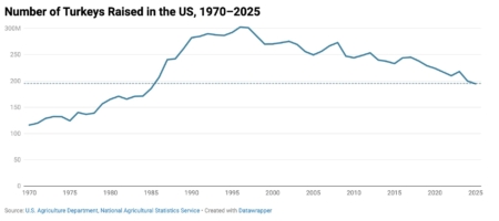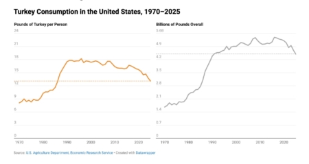 然而,火鸡的消费量随后却出现了持续稳步下降的趋势。预计在2025年,美国人均火鸡消费量将略高于13磅,降至近40年来的最低水平。
