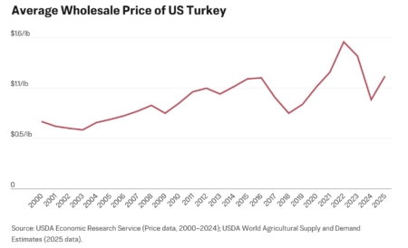 预计今年火鸡销售额将为48亿美元,比2024年的37亿美元增长约30%。但这仍比2022年下降了33.3%。2022年美国火鸡销售额出现巅峰,当年收入高达71.2亿美元。然而,也是从2022年开始,禽流感疫情爆发并持续至今。