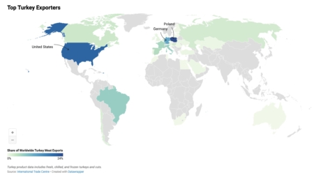 《大纪元时报》对总部位于瑞士日内瓦的国际贸易中心(International Trade Centre,联合国和世界贸易组织的联合机构)数据的分析显示,波兰为全球最大的火鸡出口国,占据24%的市场份额,其次是美国(20%)和德国(12%)。