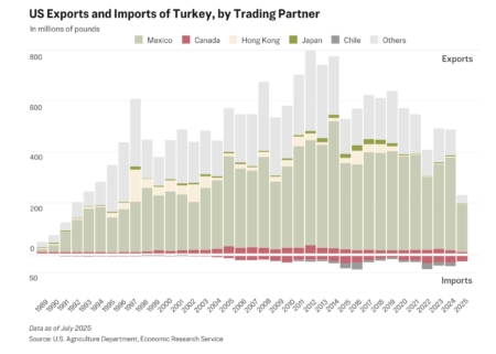 墨西哥是美国火鸡的最大买家,占美国火鸡出口总量的 81.5%(截至2025年7月数据)。自2020年以来,加拿大已经取代香港,成为美国火鸡的第二大出口目的地。