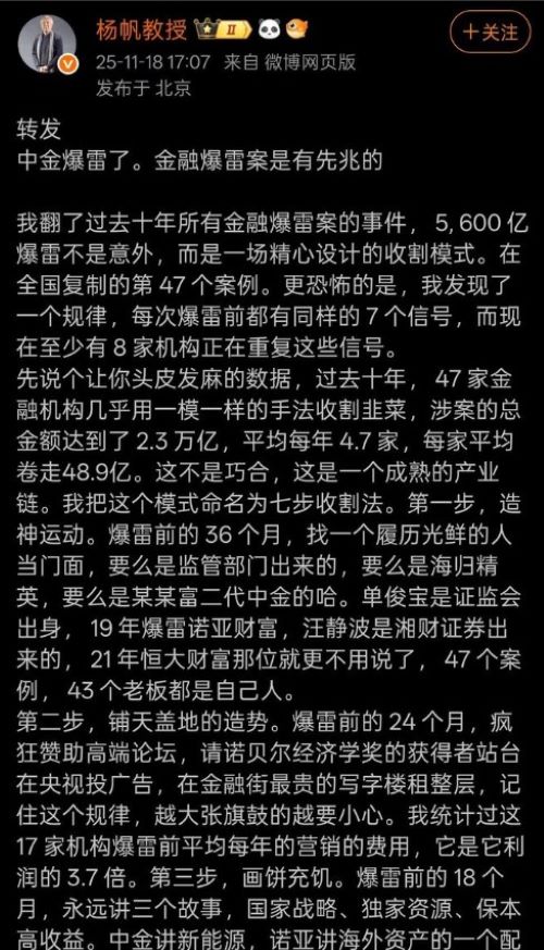 中国政法大学教授杨帆本月18日在微博上发文称:“中金爆雷了,金融爆雷案是有先兆的。”