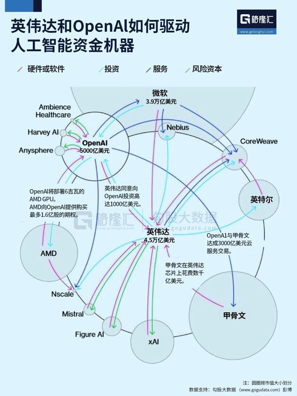 英伟达向xAI注资20亿美元,xAI却借贷125亿美元采购英伟达芯片;微软向OpenAI投入130亿美元,OpenAI承诺斥资500亿美元购买微软云服务;微软为该云平台订购价值1000亿美元的英伟达芯片;甲骨文向OpenAI提供3000亿美元云服务额度,OpenAI则为甲骨文数据中心订购英伟达芯片。
