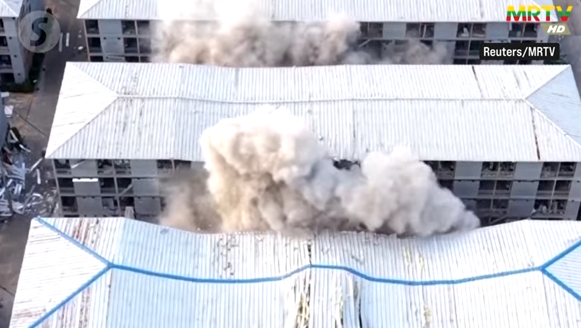 缅甸军政府大规模清剿KK园区,敏昂莱下令炸毁大楼。(图/youtube/The Star)