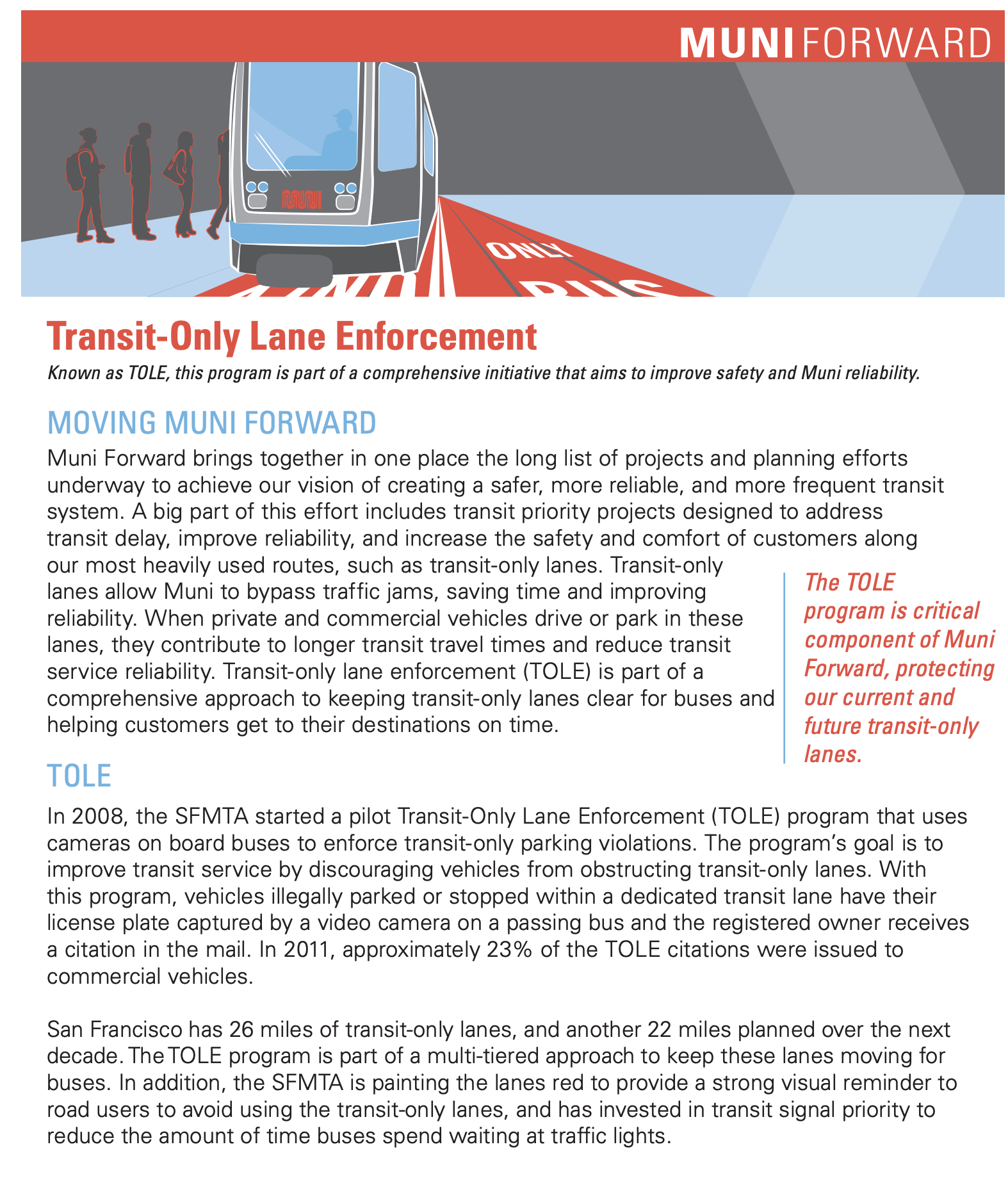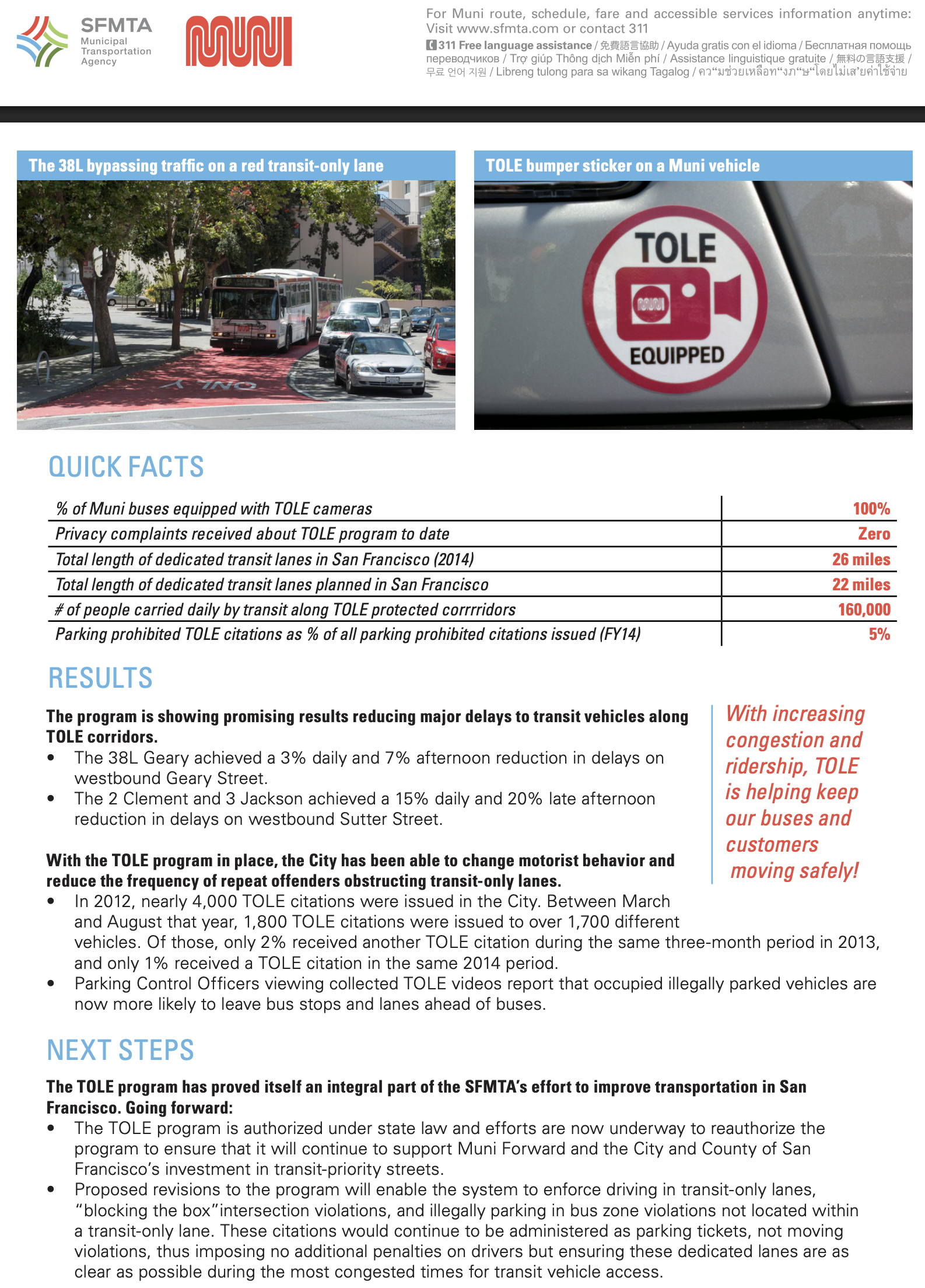 旧金山目前使用的公交专用道执法系统(TOLE)自2008年运行至今,技术与运作方式都显得相当陈旧。系统通过公交车前置摄像头拍摄占用公交专用道的车辆,由两名官员逐帧人工审核视频,再手动发出罚单。然而由于人员限制,每天最多只能开出约20张罚单。