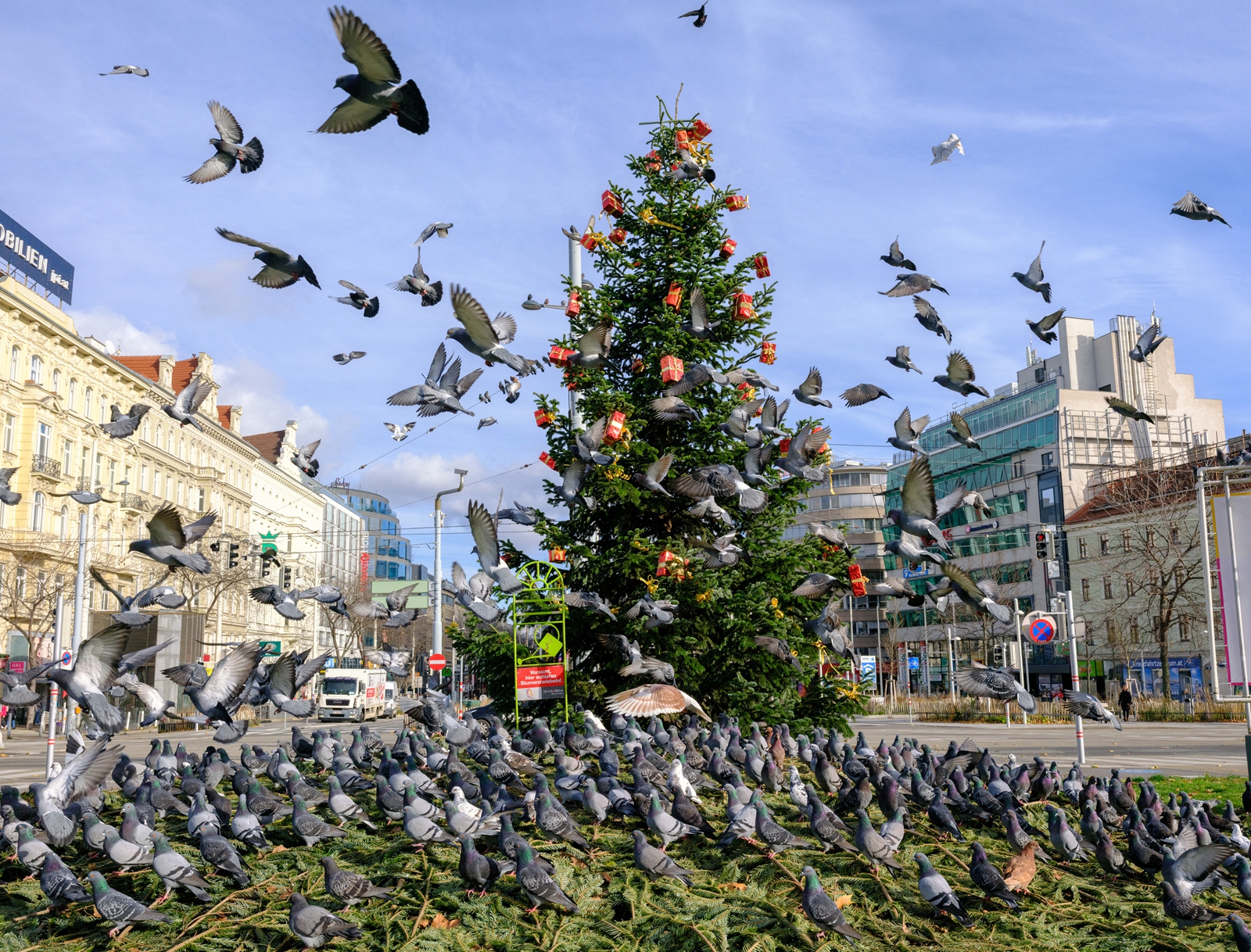 2025年11月19日,在奥地利萨尔茨堡圣诞市场(Salzburg Christmas market),一颗巨大的圣诞树被点亮。(BARBARA GINDL/APA/AFP via Getty Images)2025年11月18日,一群鸽子聚集在奥地利维也纳一座广场上的圣诞树周围。(Joe Klamar/AFP via Getty Images)