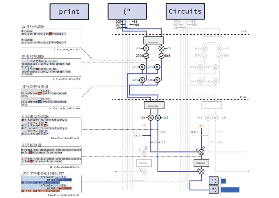 它做的第一步是标记。当模型读到开头的 (" 时,电路中的一个组件被激活。它向信息流中写入了两条信息,先用引号检测器标明这里有个引号(位置标记),再用一个类型分类器判别了一下标记的类型,确认这是个双引号(类型标记)。