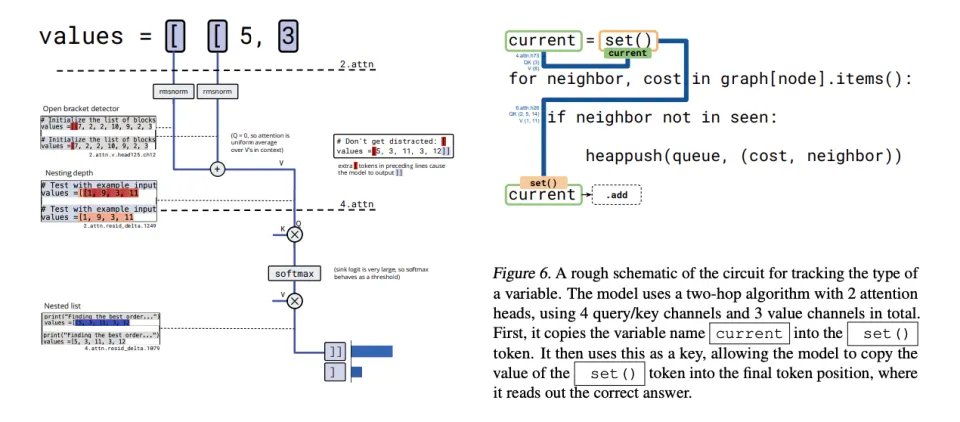 研究人员甚至发现了更复杂的变量追踪电路,模型通过两层注意力机制,像接力跑一样,先把变量名存入内存,再在需要时通过变量名检索出它的类型。