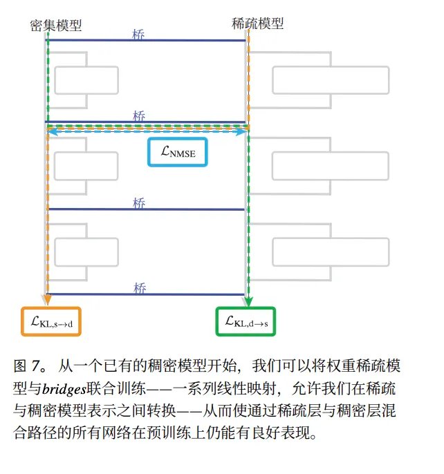 这一桥接的方法,就是冻结那个强大的密集模型,然后在它旁边训练一个小的稀疏模型。同时,训练一组翻译层,让它们时刻保持同步。