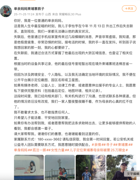 稍早,“单亲妈妈柬埔寨救子”在微博发布的信息说,11月13日,儿子李怡亨外出工作后失去联系,直到现在,一家人都无法确认他的真实状况。