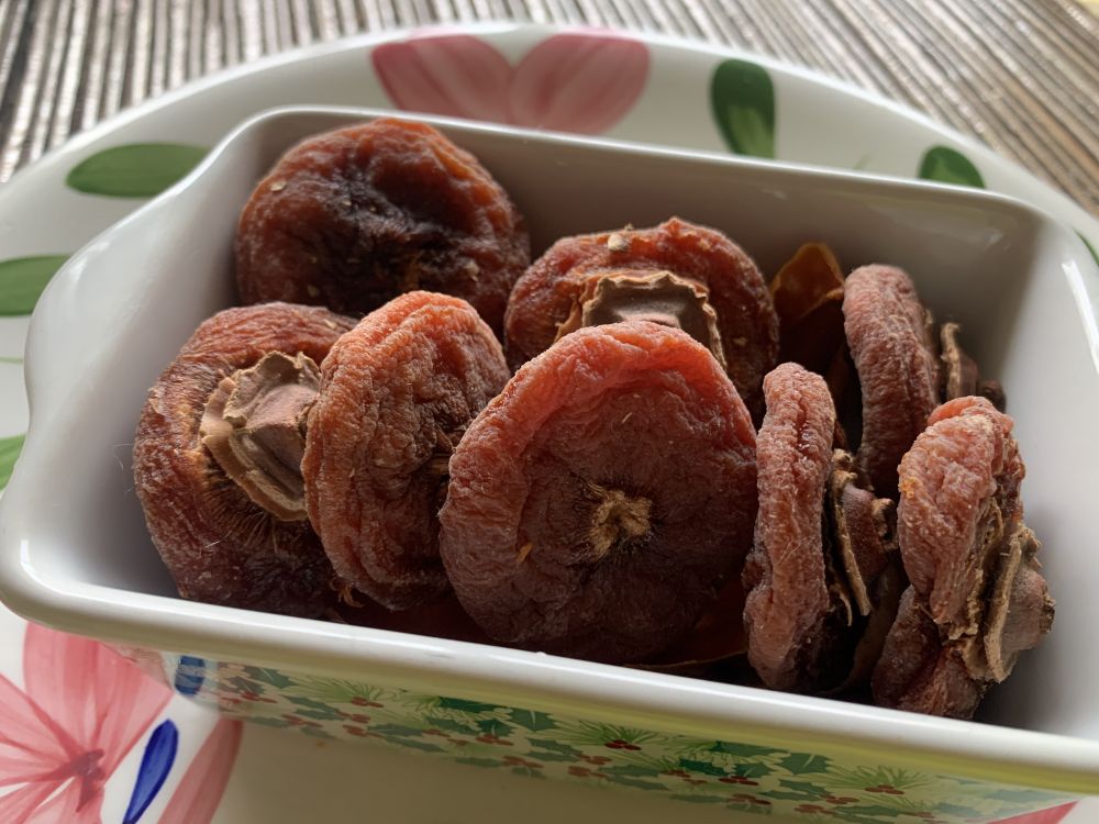 第三步,出霜,户外晾凉,大约六周,似乎没什么霜结?明年再试一试,经验是尽量削掉所有的外皮。因为柿饼晒几天之后,若是还有留存外皮,外皮就会被晒得如玻璃般的硬。