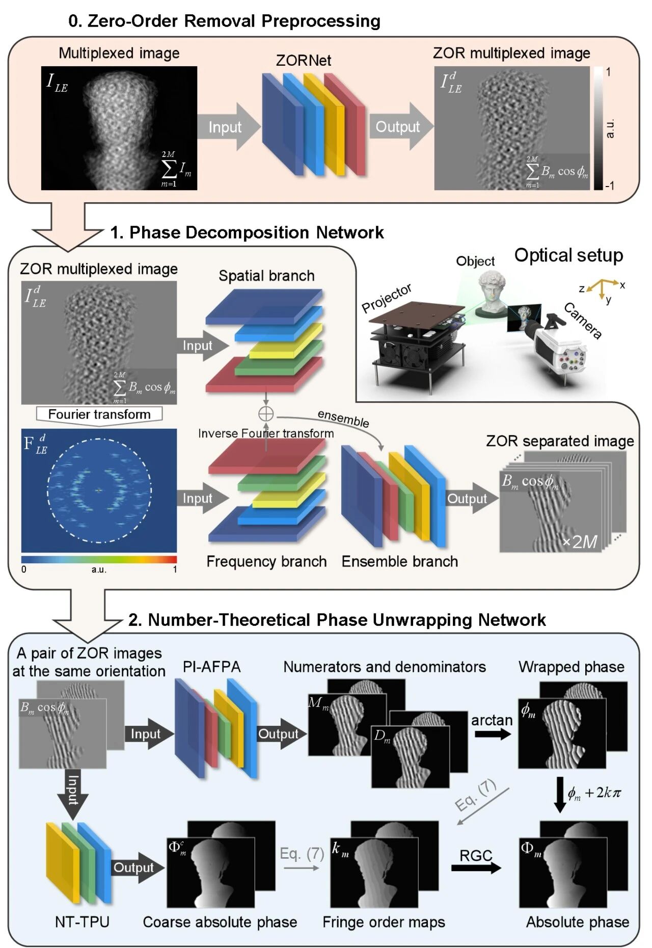 南京理工大学陈钱、左超教授团队,联合波兰华沙理工大学Malgorzata Kujawinska和Maciej Trusiak教授,共同提出了一种融合频分多路复用与深度神经网络的新型三维成像方法——基于双频角度复用的条纹投影轮廓术,可突破硬件物理极限,实现超越相机帧率一个数量级以上的时间超分辨三维成像。