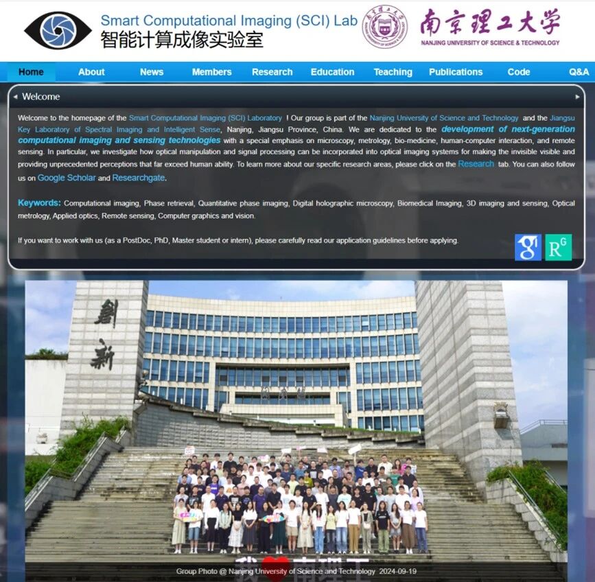 南京理工大学智能计算成像实验室(SCILab:www.scilaboratory.com)隶属于南京理工大学光学工程国家一级重点学科带头人陈钱教授领衔的“光谱成像与信息处理”教育部长江学者创新团队、首批“全国高校黄大年式教师团队”。实验室学术带头人左超教授为教育部长江学者特聘教授、国际光学工程学会会士(SPIE Fellow)、美国光学学会会士(Optica Fellow)、英国物理学会会士(IOP Fellow),入选科睿唯安全球高被引科学家。实验室致力于研发新一代计算成像与传感技术,在国家重大需求牵引及重点项目支持下开展新型光学成像的机理探索、工程实践以及先进仪器的研制工作,并开拓其在生物医药、智能制造、国防安全等领域的前沿应用。研究成果已在SCI源刊上发表论文270余篇,其中46篇论文被选作OEA、Light、Optica等期刊封面论文,25篇论文入选ESI高被引/热点论文,论文被引近2万次。获中国光学工程学会技术发明奖一等奖、江苏省科学技术奖基础类一等奖、日内瓦国际发明展“特别嘉许金奖”等。培养研究生6人获全国光学工程优秀博士论文/提名奖,5人获中国光学学会王大珩光学奖,13人入围Light全国光学博士生学术竞赛全国百强,获“挑战杯”、“创青春”、“研电赛”全国金奖十余次,“互联网+”全国总冠军。师生双创事迹得到央视《焦点访谈》、人民网、新华网、光明日报、中国教育电视台等百余家媒体报道,社会辐射影响广泛。