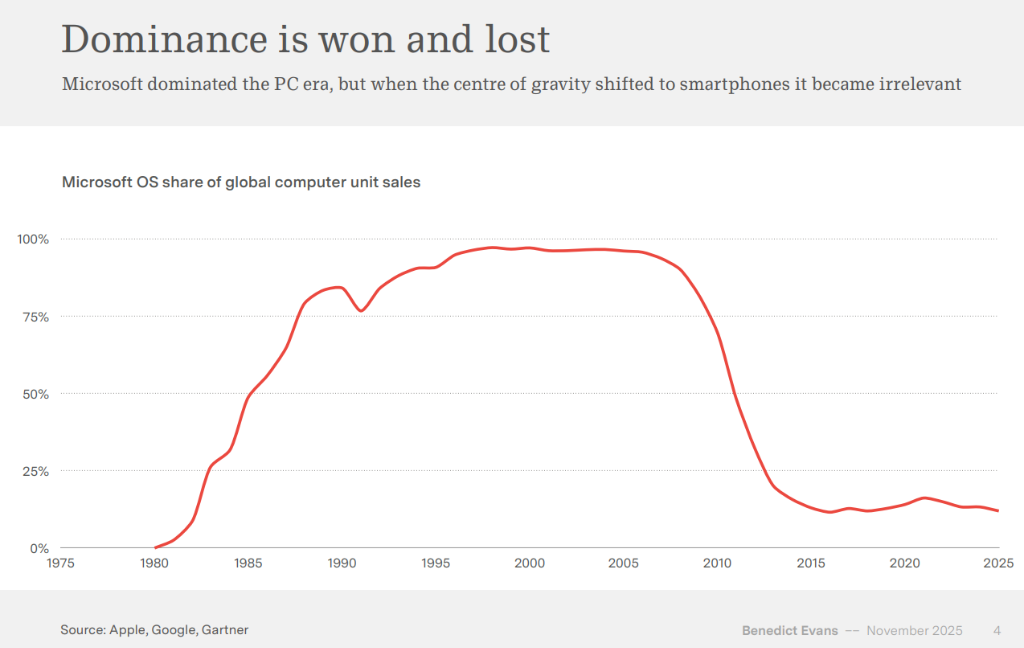Evans在报告中指出,科技产业大约每十到十五年就会经历一次平台转移,从大型主机到个人电脑,从万维网到智能手机,每一次转移都重塑了整个行业格局。微软的案例印证了这种转移的残酷性:该公司曾在个人电脑时代拥有接近100%的操作系统市场份额,但当重心转向智能手机时几乎变得无关紧要。
