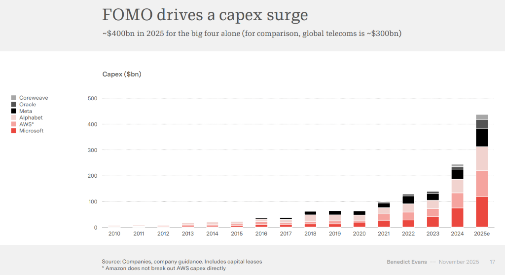 科技巨头正以前所未有的规模投资AI基础设施。2025年微软、AWS、谷歌、Meta四家公司资本支出预计达4000亿美元,相比之下全球电信业年度投资约为3000亿美元。