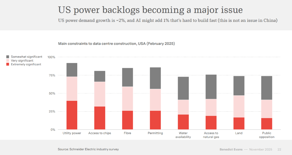 根据施耐德电气的行业调查,美国数据中心建设的主要限制因素是公用电力供应,其次是芯片获取和光纤接入。美国电力需求增长约为2%,而AI可能额外增加1%的需求,这在中国不是问题,但在美国却难以快速建设。