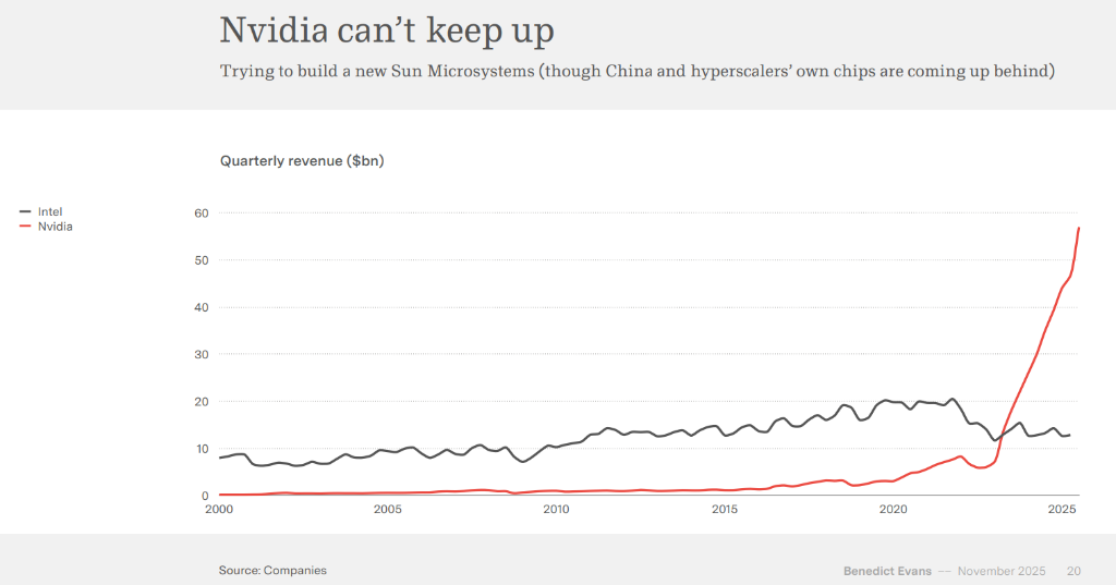 美国数据中心建设正在超越办公楼建设规模,成为新的投资周期驱动力。英伟达因无法跟上需求而面临供应瓶颈,其季度收入已超越英特尔多年的积累。台积电同样无法或不愿足够快速地扩张产能以满足英伟达的订单需求。