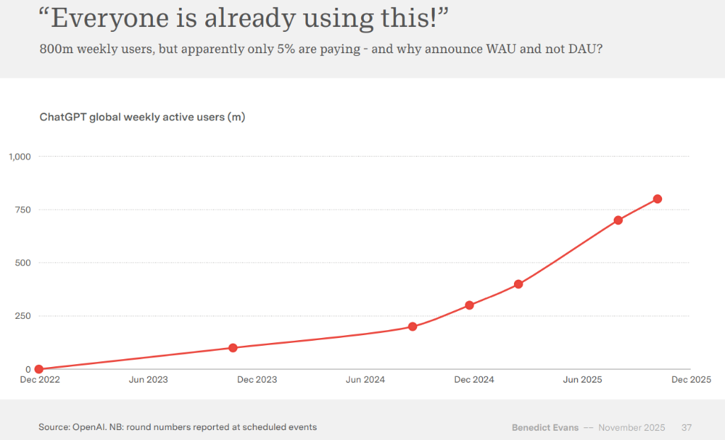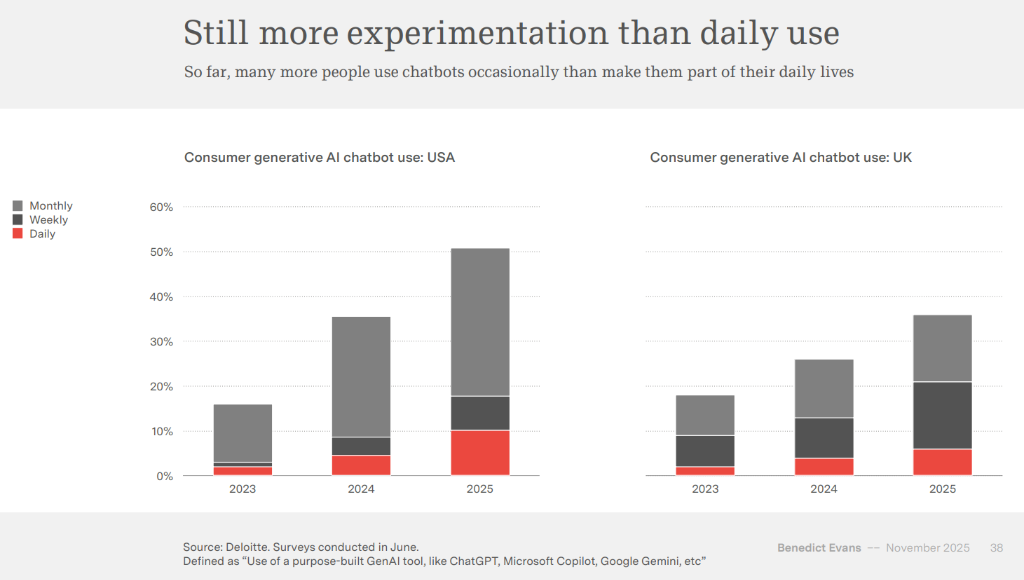 Evans 将其称为典型的“参与度幻觉”:AI 渗透速度惊人,但尚未成为全民级的日常工具。