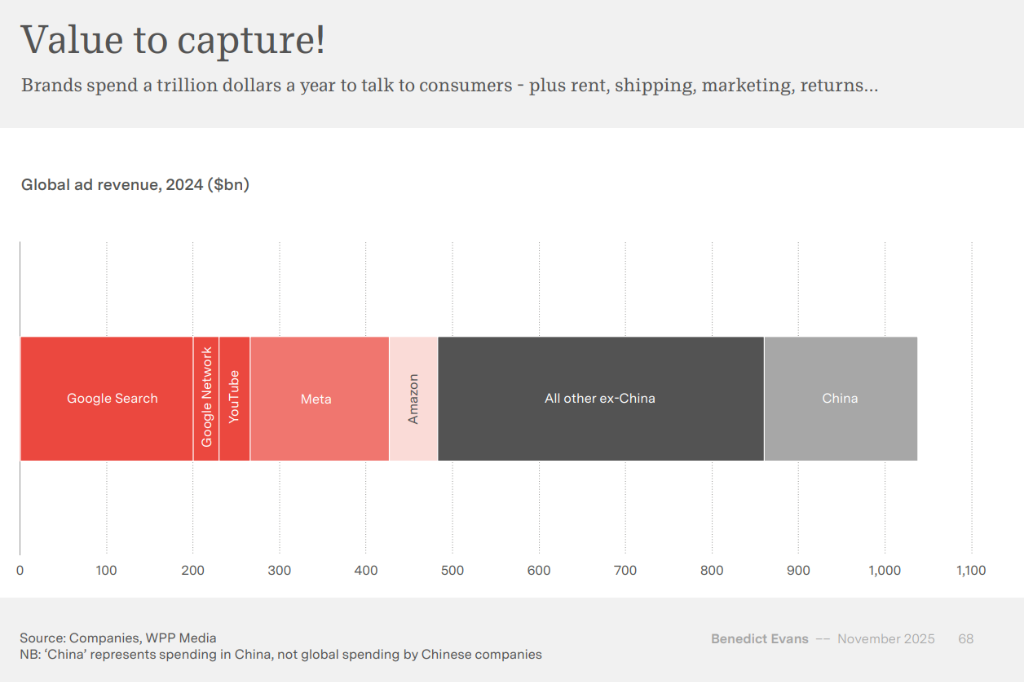 谷歌和Meta已经披露早期数据:AI驱动的广告投放能带来3%—14%的转化率提升。广告创意制作成本也可能从每年1000亿美元的大盘上进一步被自动生成技术重塑。
