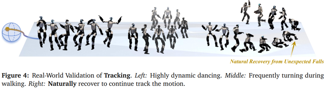 即便被完全摔倒在地,它也能通过自然流畅的动作爬起,然后回到原本任务,比如继续恢复站姿或目标姿态。这些恢复动作不是硬性编写的,而是策略在潜在空间中自然表达出来的,这让机器人显得更“像人”。