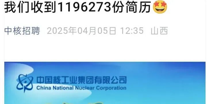 中核集团2025届校园招聘共提供1,730类岗位,预计录用约8,000人,却吸引了1,196,273份简历投递。