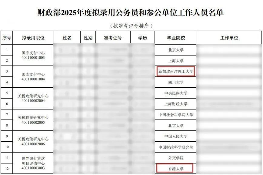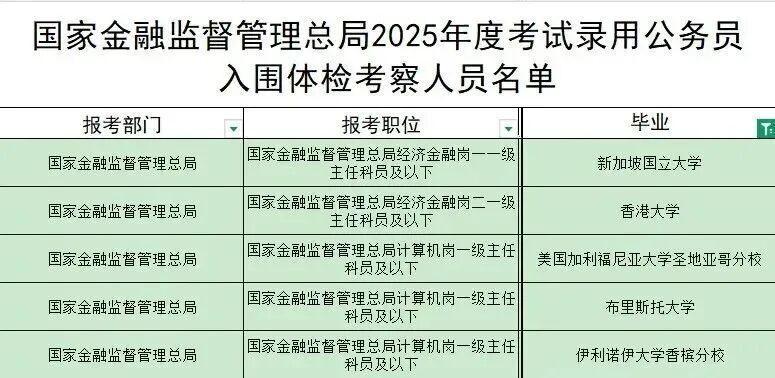 2025年金融监管局的录取名单中,不乏香港大学、新加坡国立大学、加州大学圣地亚哥分校、伊利诺伊大学香槟分校、香港中文大学毕业生的身影。