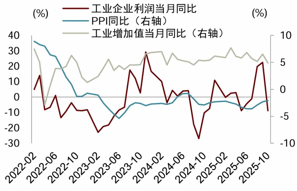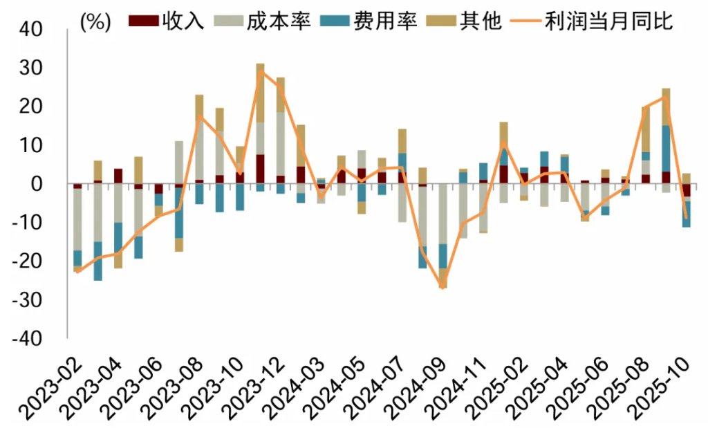 营收下降、费用增加、投资收益减少导致工企利润回落。对工企利润进行拆分,10月营收、成本、费用和其他损益分别贡献了-3.3、-1.3、-6.7和2.6个百分点。相比于9月,营收、费用对利润的贡献由正转负,其他损益的贡献大幅减少,是工企利润回落的主要原因。(1)10月,工业企业营收同比下降3.3%,较上月回落6.4个百分点。受到出口交货值由正转负,部分行业“反内卷”的影响,10月工业增加值同比增长4.9%,较上月回落1.6个百分点。10月PPI同比下降2.1%,较上月降幅收窄0.2个百分点。(2)10月,工业企业费用率同比增长0.38个百分点,或反映企业在持续降本增效后,费用率难以继续压缩。(3)我们在8月和9月的点评中指出,受股市上涨推动,工业企业的其他损益大幅上升,是其利润在8月和9月大幅增长的重要因素。由于前两个月工业企业已计入了投资收益,10月工业企业的其他损益同比增长放缓,对利润的支撑减少。8月和9月工业企业的其他损益分别为630亿元、490亿元,10月下降至201亿元。