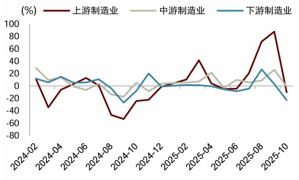 2025年10月,规模以上工业企业利润同比下降5.5%,较2025年9月增速回落27.1个百分点。营收下降、费用增加、投资收益减少导致工企利润回落。结构上,采矿业利润降幅收窄,制造业、公用事业利润增速回落。采矿业中,有色行业利润保持两位数增长,黑色系利润在低基数下反弹。制造业中,上中下游利润都有比较大的回落,上游和中游制造业受投资收益与费用拖累较大。工业企业实际库存回升。