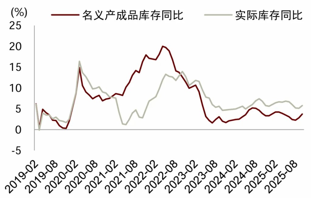 工业企业实际库存回升。2025年10月末工业企业产成品名义库存同比增长3.7%,较2025年9月末增加0.9个百分点。2025年10月末产成品实际库存同比增长5.8%,较2025年9月末回升0.7个百分点。