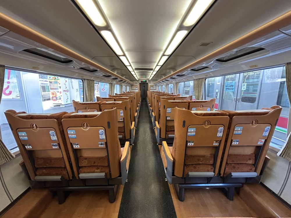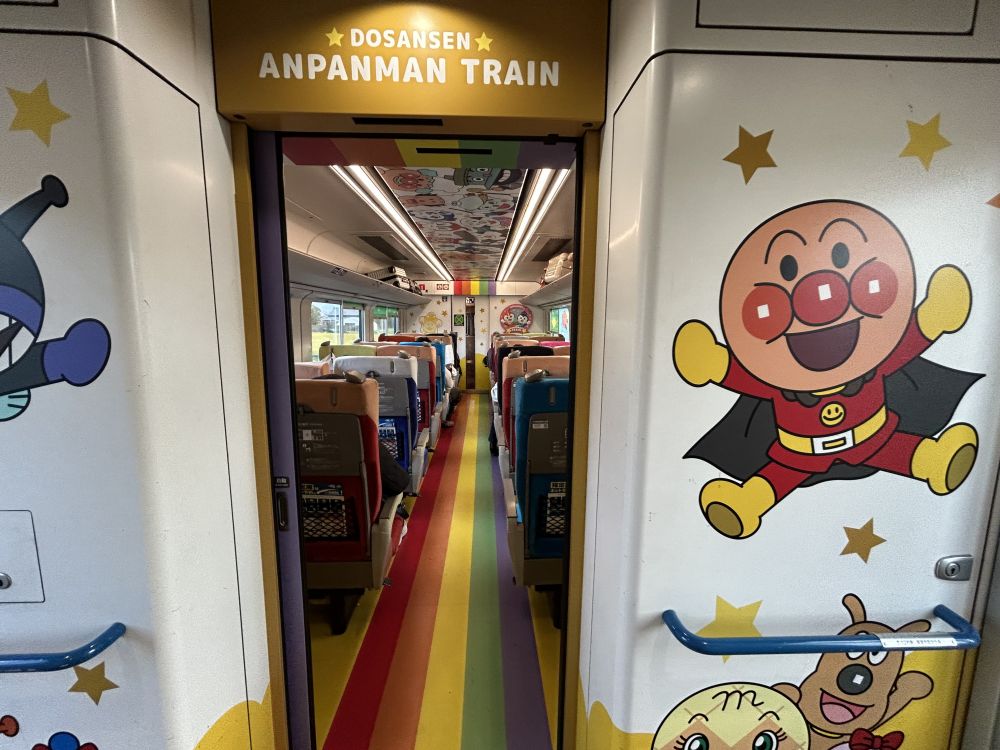 坐火车电车出行,没有刻意买某一类火车,但还是碰上了动漫人物的火车,只不过我们选的车厢是适合大人的木质感很强的座位,后门车厢全是动漫,全是爹妈带小宝宝坐的