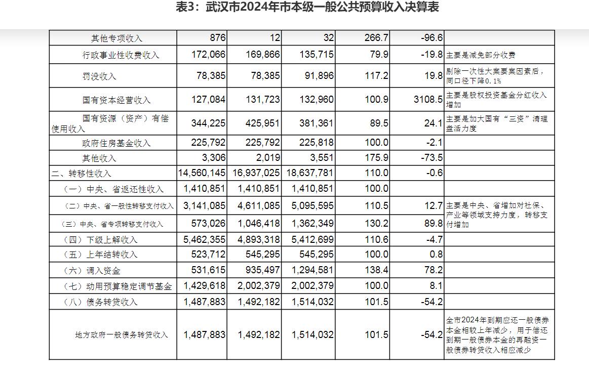 武汉市一般性转移支付收入和专项转移支付收入预算数分别为314.1亿和57.3亿元,不过,最终决算数为509.56亿和136.23亿元。武汉市财政局说明,主要是中央、省增加对社保、产业等领域支持力度,使得转移支付增加。