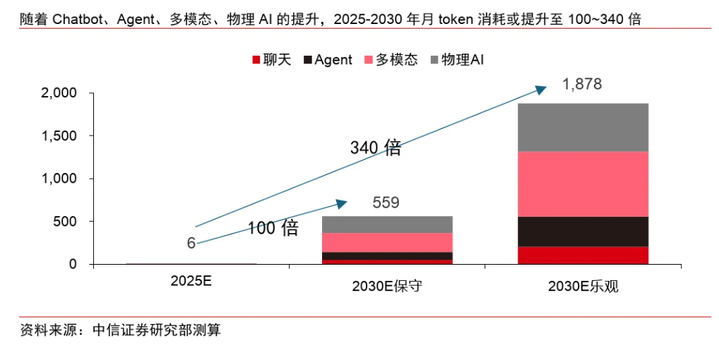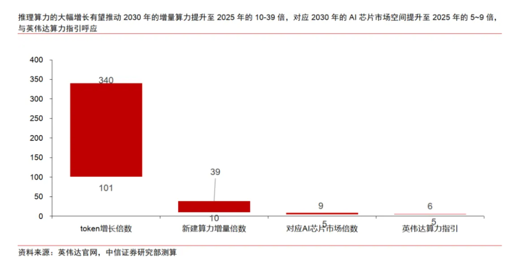 尽管AI应用的商业模式仍处于探索初期,展望2030年,不难预测,聊天、AI Agent、多模态内容生成、自动驾驶和机器人等物理AI仍将消耗海量token。即便考虑到AI模型计算效率的提升、芯片运算能力的提升、以及部分算力用于训练模型而非推理等因素,我们依然可以得到如下研究结论:预计2030年全球token消耗或增至2025年的100~340倍;进而考虑模型参数量、芯片利用率等因素,预计2030年推理算力规模或增至2025年的65~220倍;考虑推理算力占比提升,预计2030年存量算力规模或增至2025年的16~55倍;假设芯片5年使用期,预计2030年增量算力规模或增至2025年的10~39倍;考虑单位算力降价,预计2030年AI芯片市场辨模或增至2025年的5~9倍,即2030年全球AI芯片市场空间或超1万亿美元。这一预测与英伟达等科技巨头的展望接近。