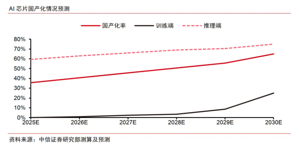 国产AI芯片:我们预计2030年的中国AI芯片市场辨模将在2025年350-400亿美元基础上,增至原来的7-9倍,增幅高于全球。中国AI芯片国产化率有望从2025年30~40%提升至2030年的60~70%水平。