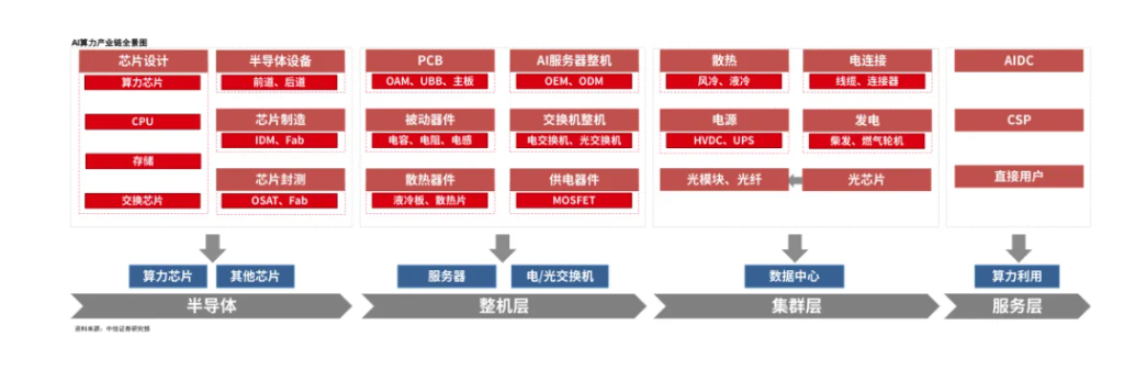 国产AI算力产业链:国产AI芯片仍落后英伟达,导致AIDC功耗和散热面临压力,为液冷、AI电源等环节带来机遇。此外,输配电、柴发、存储、光通信、材料等更多领域都值得关注。