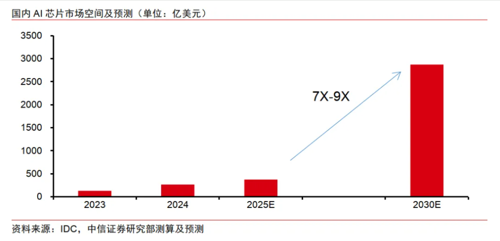 预计2030年的中国AI芯片市场辨模将在2025年350-400亿美元基础上,增至原来的7-9倍