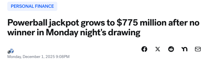 由于周一晚间的强力球(Powerball)彩票开奖再次无人中得头奖,目前头奖金额已攀升约7.75亿美元。
