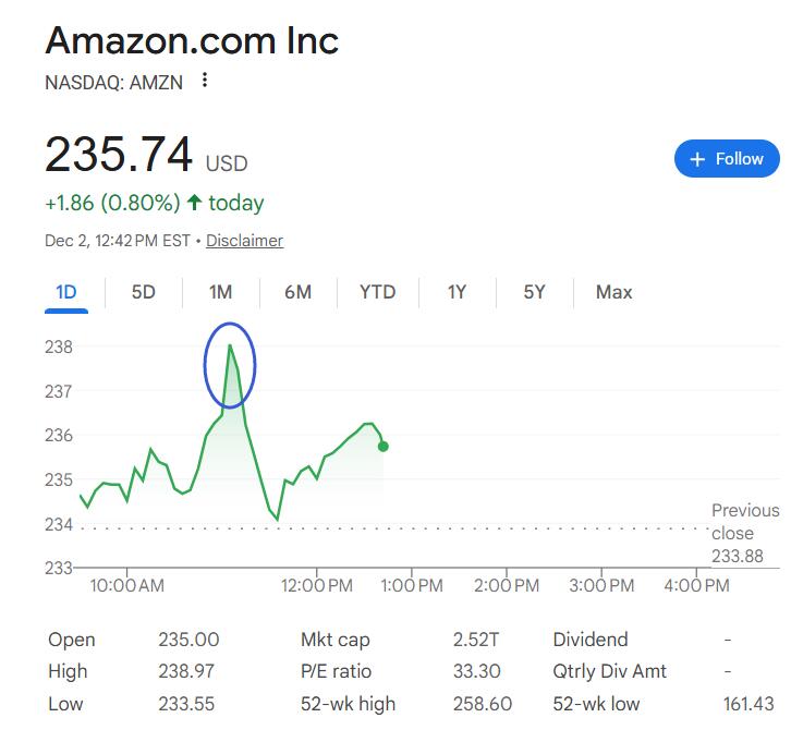 新AI芯片的消息公布后,亚马逊股价逼近239美元刷新日高,日内涨幅扩大到将近2.2%,而盘初曾涨3.2%的英伟达股价进一步收窄涨幅,美股早盘尾声时刷新日低,几乎抹平所有涨幅。其竞争对手AMD的股价也刷新日低,日内跌近1.7%。