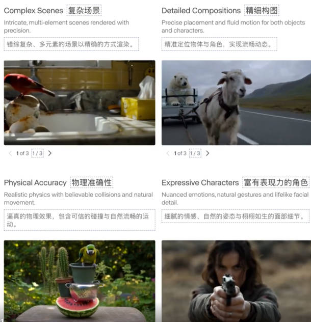 在复杂场景、精细构图、物理准确性上都表现出色,并且能生成富有表现力的角色。