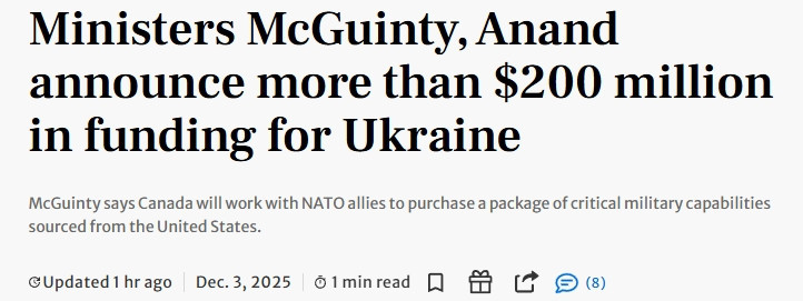 加拿大外交部发表的新闻稿称,自2022年以来,加拿大已向乌克兰承诺近220亿加元的资金支持,其中包括到2029年为止65亿加元的军事援助。