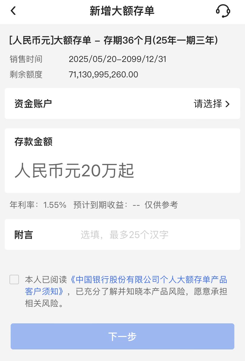 相比之下,中国银行目前仍有20万元起存的3年期大额存单在售,且额度充足。
