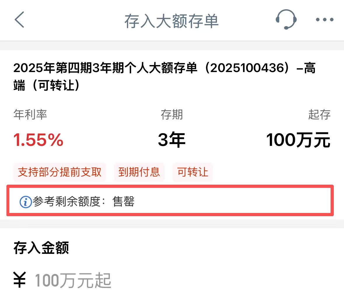 今天,潮新闻记者登录工商银行APP,在“大额存单”栏目中看到,排在第一个的产品为2025年第四期3年期个人大额存单,起步门槛标注为“100万元起存”,年利率为1.55%。点击进入产品详情页,页面显示产品已经售罄。