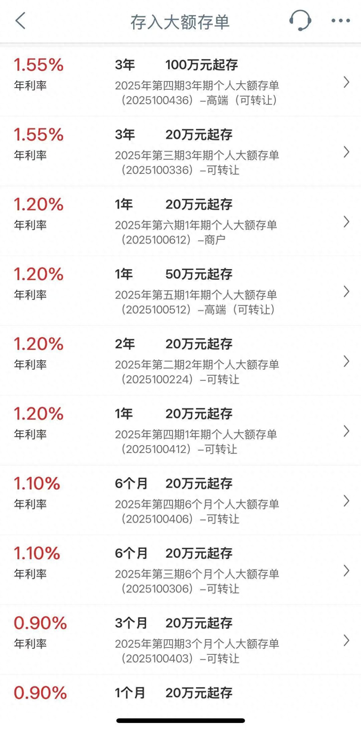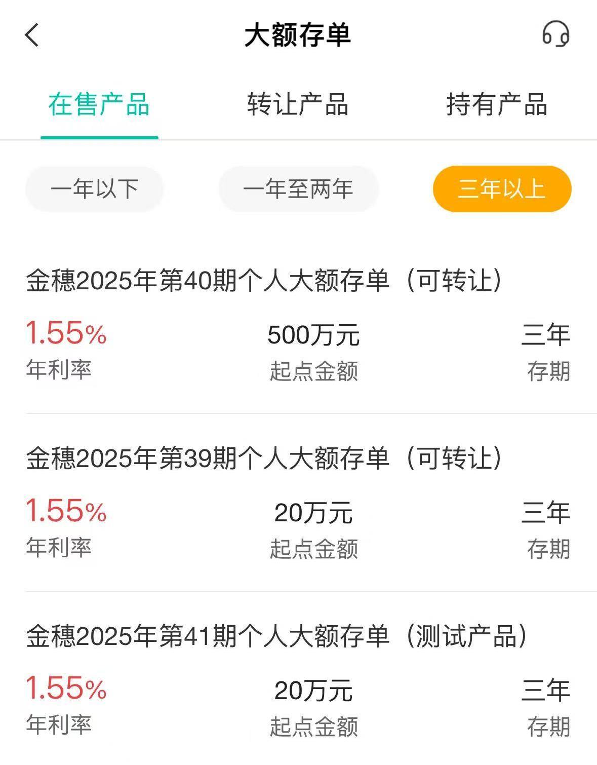 随后,记者登录农业银行APP,该行在售的最新一期3年期大额存单产品:“金穗2025年第40期个人大额存单(可转让)”,起点门槛竟然高达500万元,利率同样为1.55%。