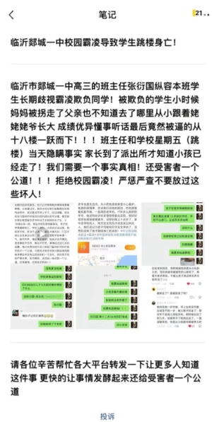 据称,本来他明年可以考入一个很好的学校,但因从小失去父母,在外婆家长大,从而遭到以班长颜某为首的同学霸凌,被嘲笑为“孤儿”,并被孤立,班主任知情却视若无睹,导致其心理崩溃,11月29日深夜从学校对面小区的18楼坠亡。