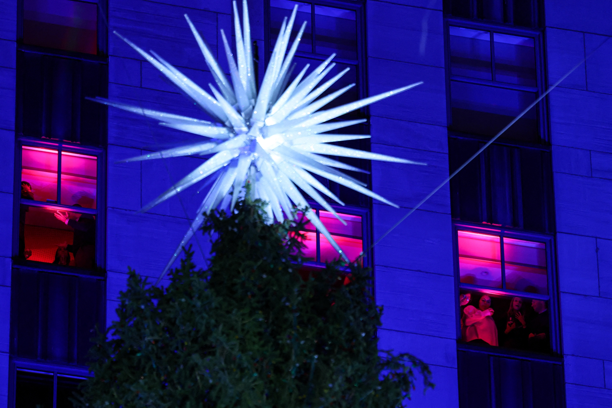 2025年12月3日晚,美国纽约洛克菲勒中心,圣诞树顶端的星型装饰上面镶嵌了300万颗施华洛世奇水晶,总重达900磅,耀眼夺目。(Charly Triballeau/AFP via Getty Images)