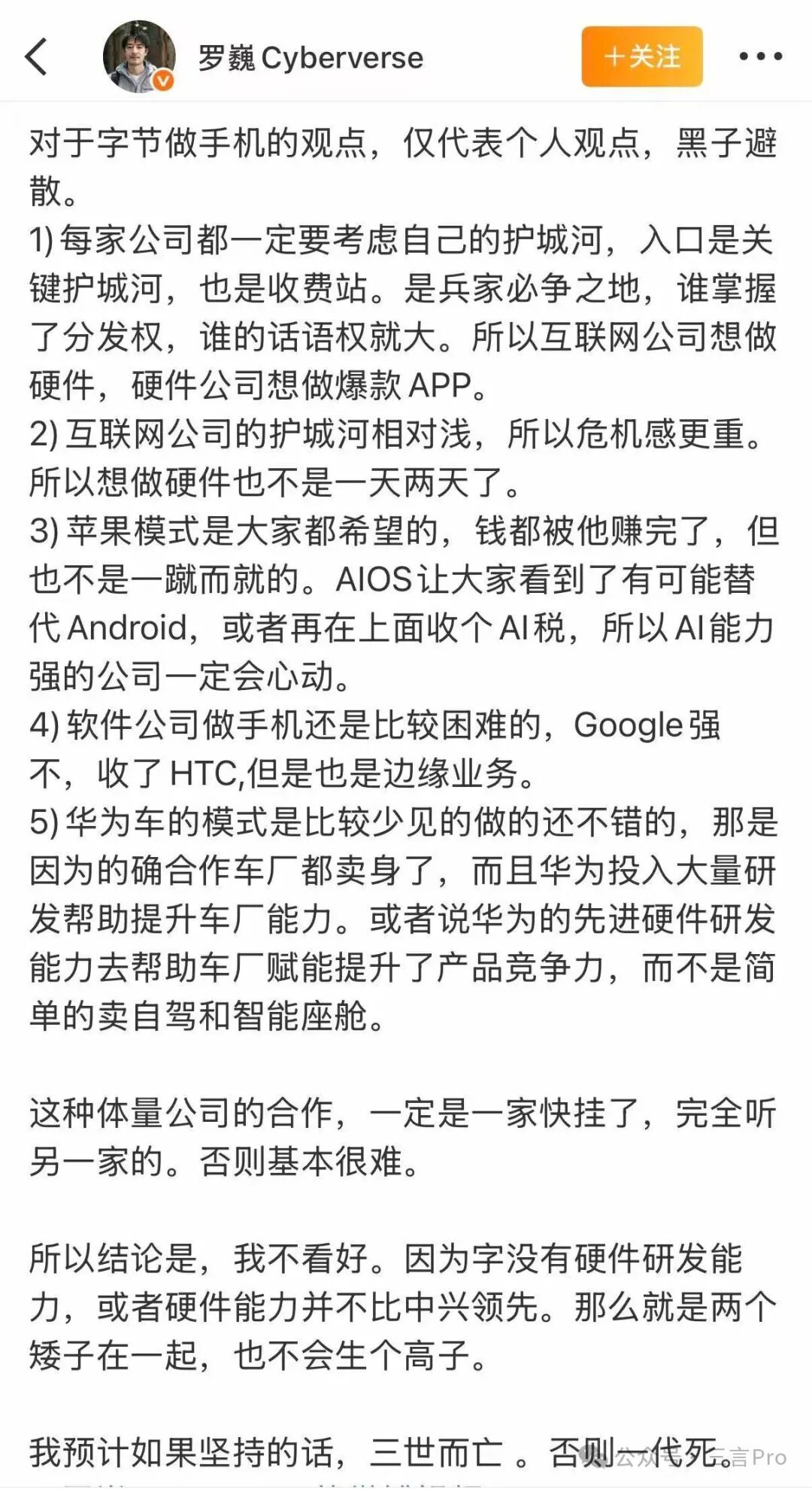 相比方飞的温和态度,罗巍的评价更为尖锐。他并不看好字节做手机,核心原因是认为字节没有硬件研发能力。
