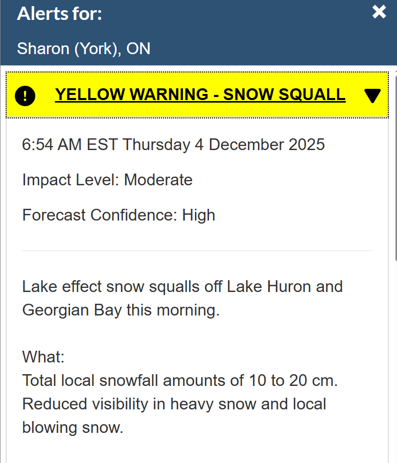 天气警报称:“来自休伦湖和乔治亚湾的湖效应雪将在今晨袭击该地区,带来短时大雪和能见度降低。”