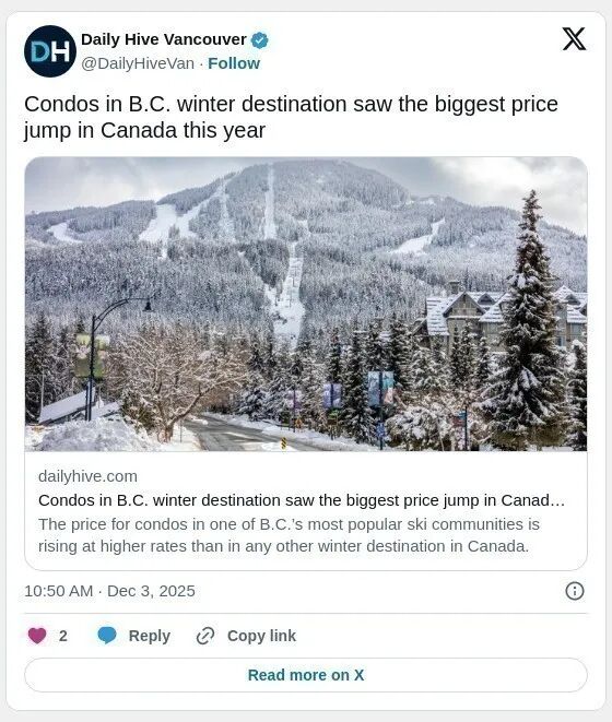 BC省最受欢迎的滑雪社区之一的公寓价格上涨速度超过加拿大其他任何冬季旅游胜地。