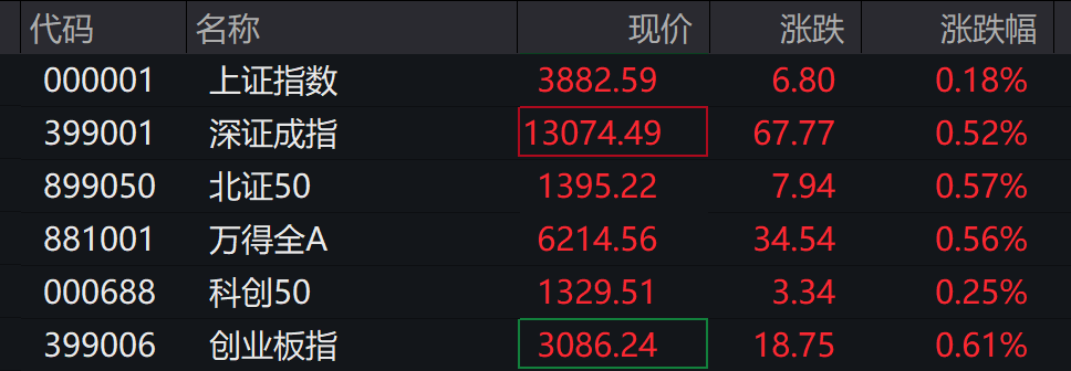 12月5日,市场早间探底回升,三大指数集体上扬,截至午间收盘,沪指涨0.08%,深成指涨0.39%,创业板涨0.47%。盘面上,个股涨多跌少,沪深京三市超3600股飘红,上午半天成交近1万亿。具体来看,算力硬件股走强,长光华芯涨停创新高,东田微、太辰光等涨超10%。福建板块再度爆发,安记食品4连板,三木集团等多股涨停。商业航天概念延续强势,超捷股份、航天科技等涨停。下跌方面,银行板块调整,重庆银行跌超3%。